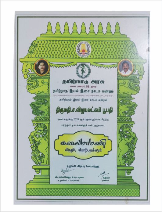 S.VIJAYALAKSHMI BHOOPATHI MA, MBA, M.Phil, PhD had received Tamil Nadu Government’s Highest Award “KALAIMAMANI” from Chief Minister.  She is the Chairman of Mayuri Academy Of Performing Arts Foundation (MAPAF). The Arts Dance and Music Development Chair had been formed in the International  Institute Of Tamil Studies Government of India and she is the custodian of the Chair. She had signed the Memorandam of Understanding with Tamil University, Thanjavur.  She is a Advisory panel Member of The Central Board of Film Certification, Central Government of India. She had Choreographed Dance in many Movies and Serials. She is the Founder Of Lions Club of Mayuri.